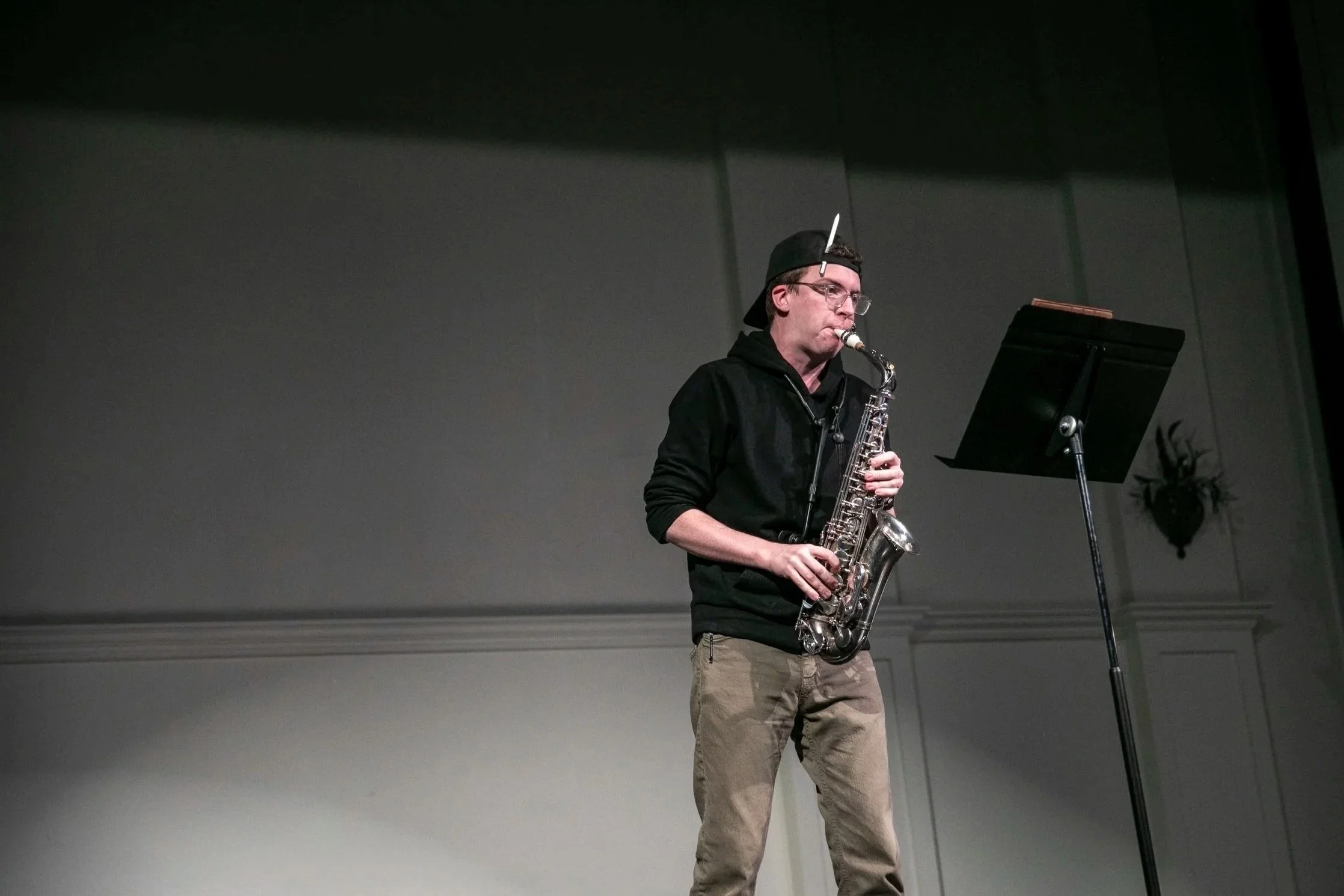 pit orchestra director, flute, soprano saxophone, alto saxophone, electronic wind instrument, slide whistle